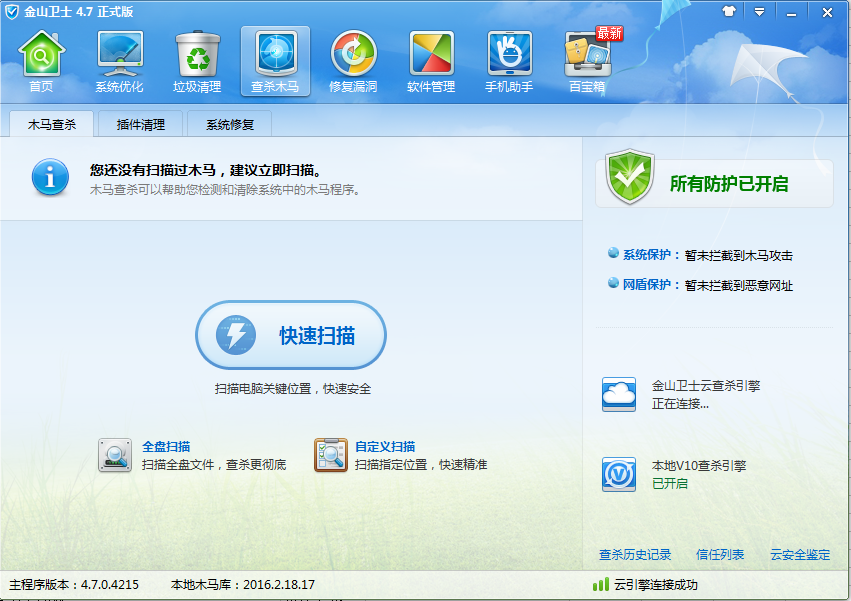 金山卫士官方版是由金山公司官方推出的一款杀毒软件,多年来不断完善,是一款集木马病毒查杀、系统安全监测、电脑插件清理优化于一体的电脑安全防护工具,金山卫士功能如此强大,体积却十分小巧…