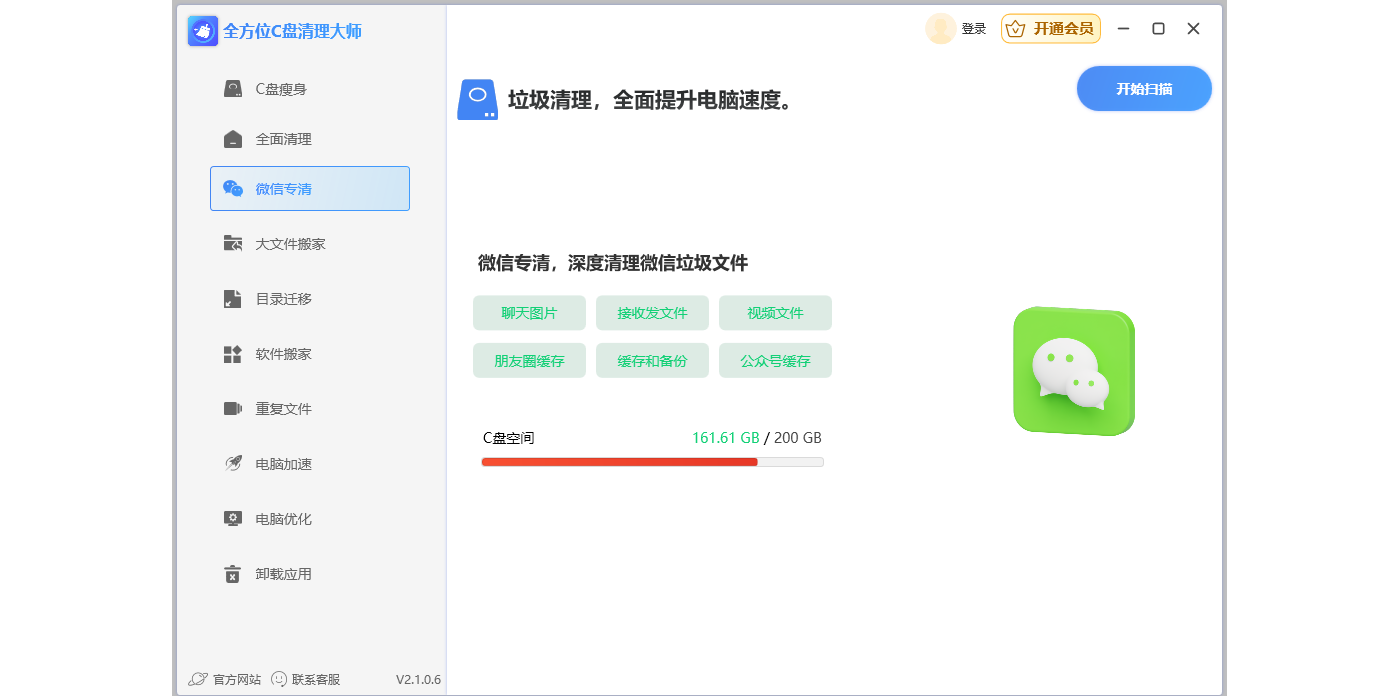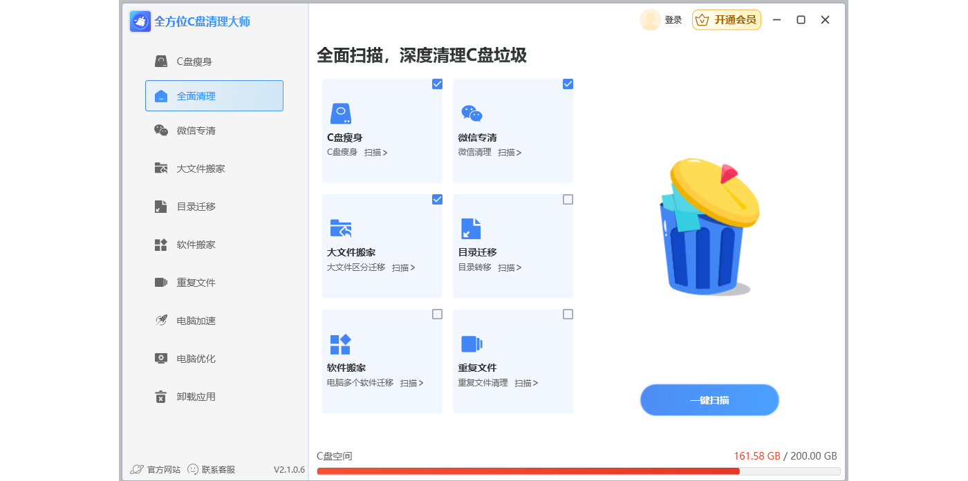 全方位C盘清理大师支持清理C盘垃圾,一键优化C盘空间,软件搬家,微信专清,电脑加速等。