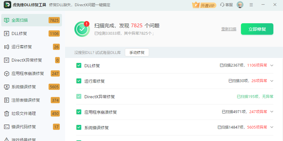 虎先锋DLL修复,一键修复电脑软件和游戏缺失DLL、DirectX导致的崩溃、卡顿、故障等问题,解决各类运行库、DirectX错误和DLL缺失问题。