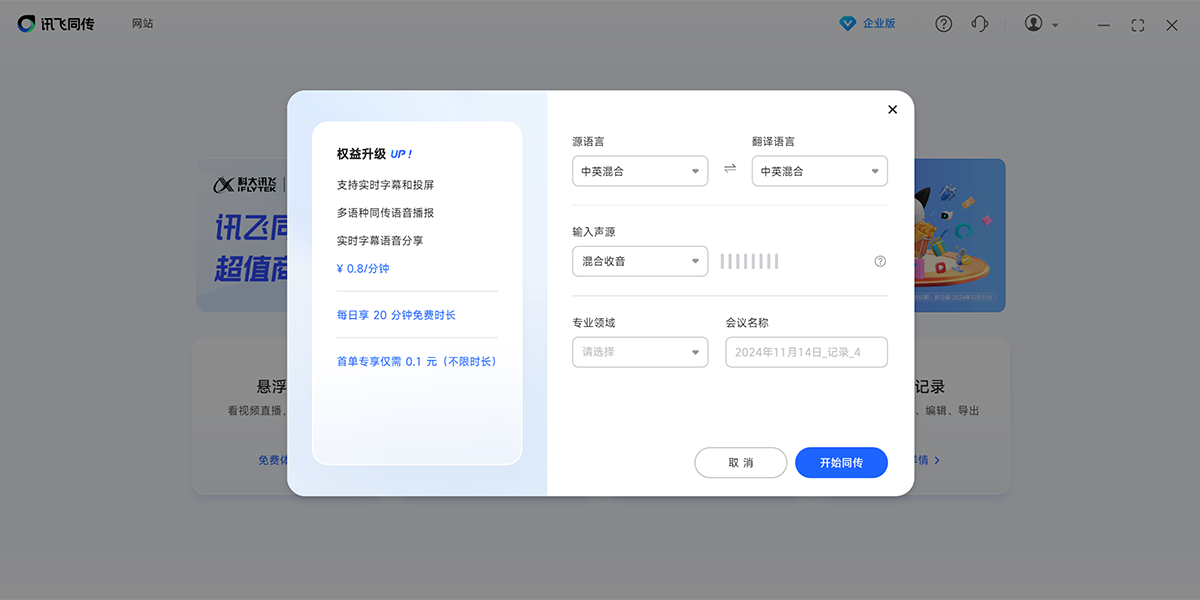 讯飞同传,基于科大讯飞的智能语音和语言技术,提供多场景多语种实时转写翻译、同声传译、直播字幕上屏和会议记录分享等一体化同传服务。